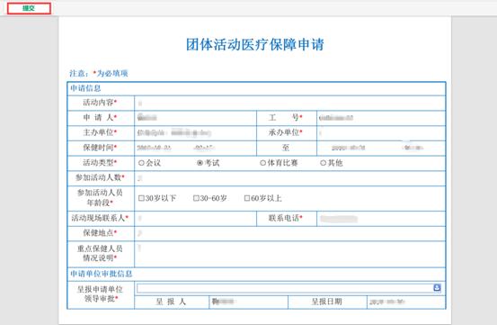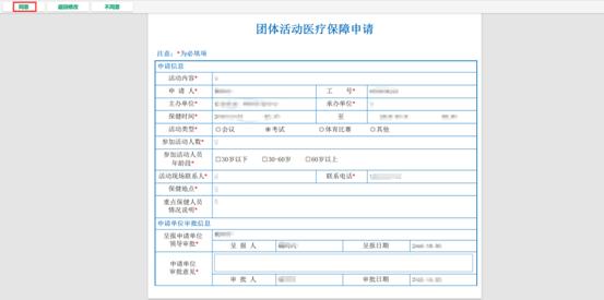 校医院根据团体活动医疗保障申请的情况进行审批,审批后申请人确认。
