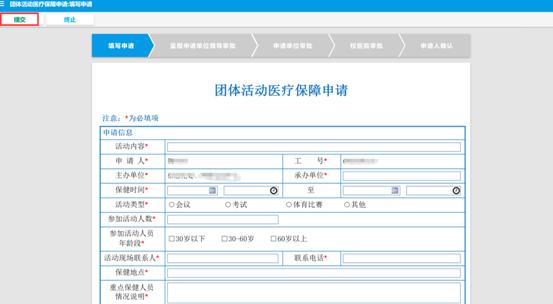 登录后点击“生活服务-团体活动医疗保障申请”。