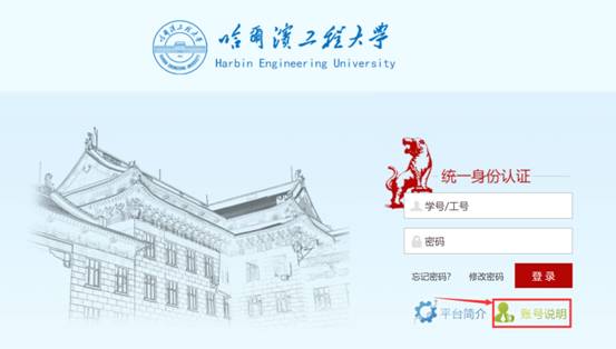 进入统一身份认证页面(网址为:one.hrbeu.edu.cn),点击页面中的账号说明了解登录的账号密码。
