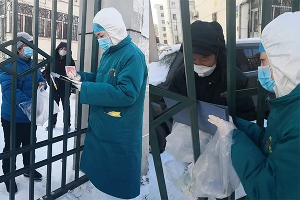 为尽量避免人员接触,医务人员通过小区围墙铁栅栏投递药品。一道铁栅栏隔开了医务人员与患者之间的距离,却隔不开人与人心的距离。在全国上下共同抗疫的特殊时期,校医院与离退休处的工作人员送去的不仅是保障健康的药品,更是温暖心灵的良方。