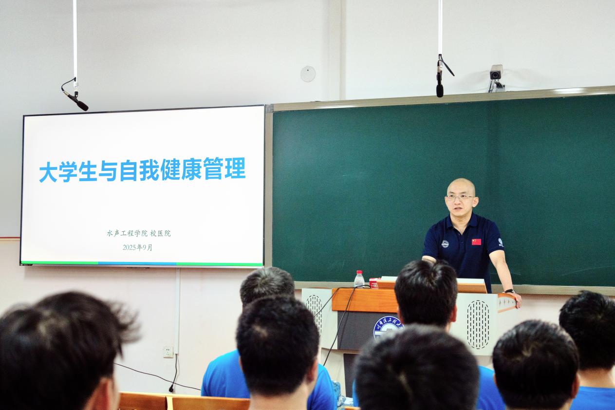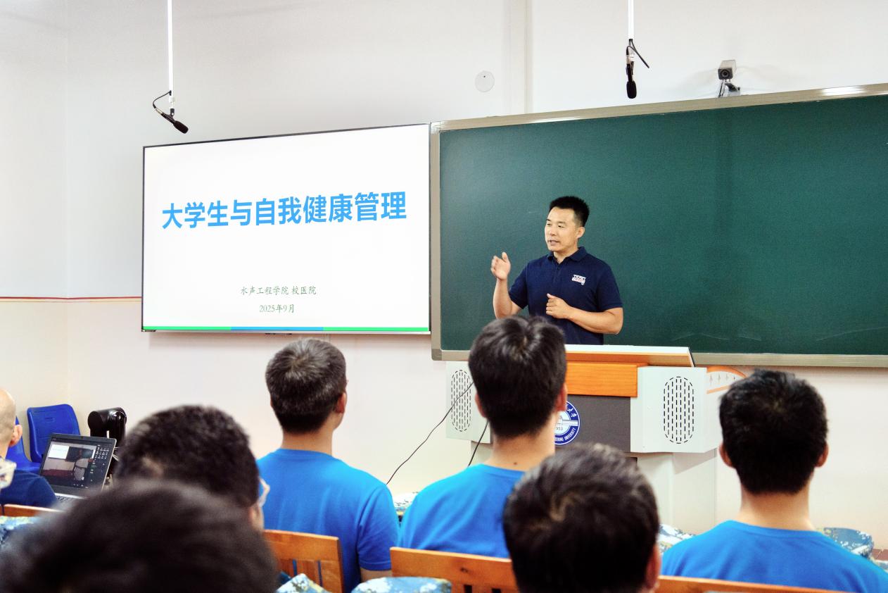 为贯彻落实国家《“健康中国2030”规划纲要》和教育部《实施全国健康学校建设计划》相关要求,深化健康学校建设,扎实做好学生入校后的健康管理工作,9月10日晚,校医院联合水声工程学院搭建家校联动学习平台,邀请国家教育部健康学校修订方案特邀专家、内蒙古自治区教育厅卫生与健康教学指导委员会副秘书长杨占新教授,针对新生刚离开家庭、缺乏独立健康管理经验的情况,面向2025级军训200余名新生及线上600余名家长共上一堂大一新生“自我健康管理”专题健康课。