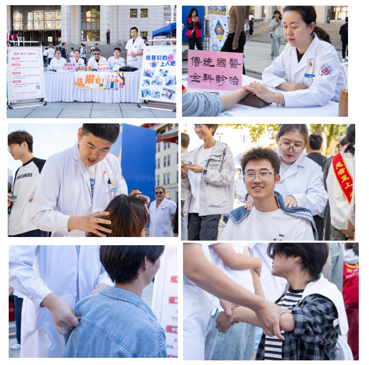 中医康复宣传展位上摆放的拔罐、脉枕等中医诊疗器具,吸引不少同学驻足了解。校医院中医科医师为同学们简要讲解了一些运动损伤预防及伤后处理的方法,并邀请同学们现场体验中医按摩技法。柔中带劲的按摩手法,让不少长期低头、肩颈劳损的同学直呼“松快了”。